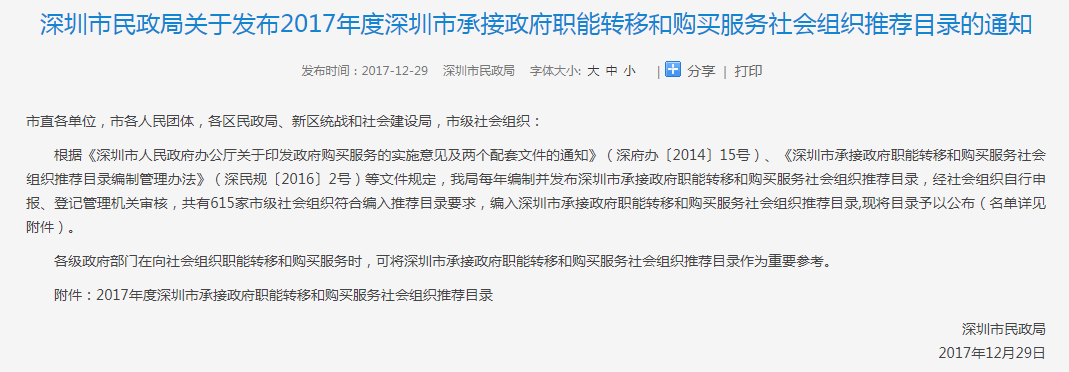 完成深圳市承接政府职能转移与购买服务社会组织推荐目录申报