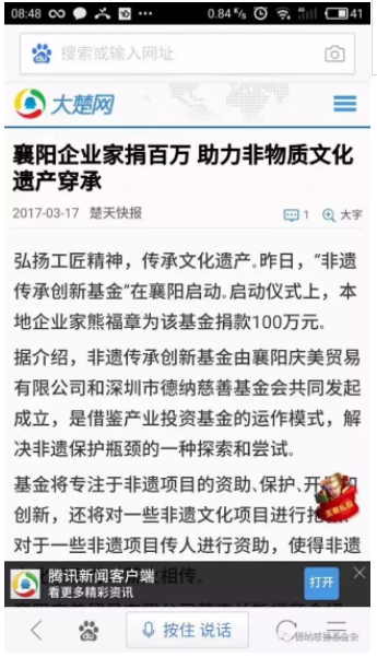【传承践行】为弘扬工匠精神、促进非遗文化事业的传承、保护。3月16日晚,由深圳市德纳慈善基金会联同襄阳庆美贸有限有限公司共同发起成立的“非遗传承创新基金”启动仪式在湖北襄阳举行。